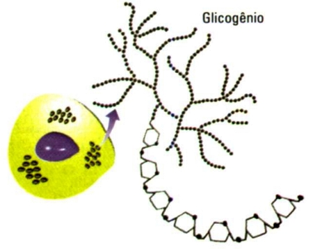 O glicogênio é semelhante ao amido porém suas cadeias são mais curtas e ramificadas. É uma reserva de glicose de pequena escala para animais e fungos.